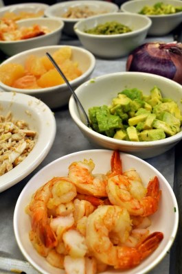 Verrines are now popular dish in France, and now it became so popular that everything is served in a glass in France (or so she says). It’s pretty common for me too, I see verrines all the time at the restaurants I go to, but I didn’t know that there was a name for that kind of thing. In two groups, we made a custard&berry desert and shrimp/avocado/crab/grapefruit savory verrines.