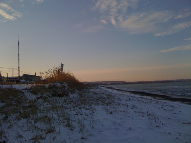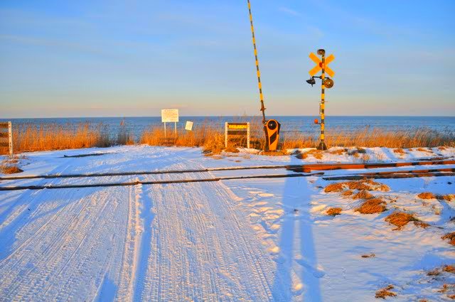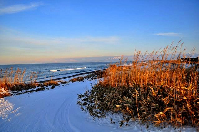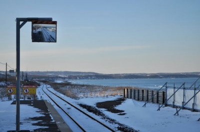 In front of the platform, across the track, is a wide open seashore. The seashore covered in snow, the waves strong. It was sunny, but the light is very weak and powerless. At 14:50, it was already looking like sunset.