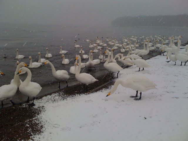 川湯温泉に一泊しています。昨晩とは一変して、朝から雪がちらつき、本降りになりました。屈斜路湖の砂湯付近には白鳥が沢山湯治をしています。この辺りの白鳥は餌を探しに畑の方まで行くことがないので、真っ白で、写真家の間では有名だそうです。