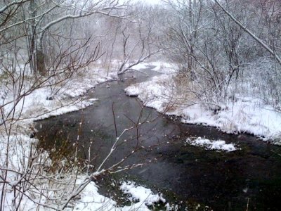 After settling in, I took a walk around in the snow. I walked down to a brook, then took a big turn within the property. The innocent snow turned into a bit like a snow storm, so I could not venture out of the site.