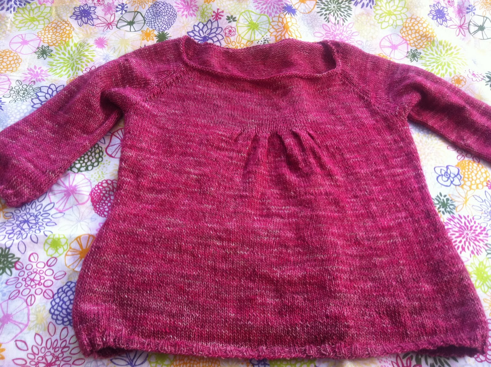 Mods: Skipped one last increase round on torso. Added 2 extra rows of stockinette and 1 purl row to the neck line before binding off. Made sleeves shorter.