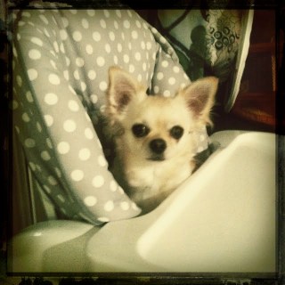 While I was sewing the hem (the finishing), one of the dogs, Rey, climbed up my niece’s (baby) chair on her own. So cute.