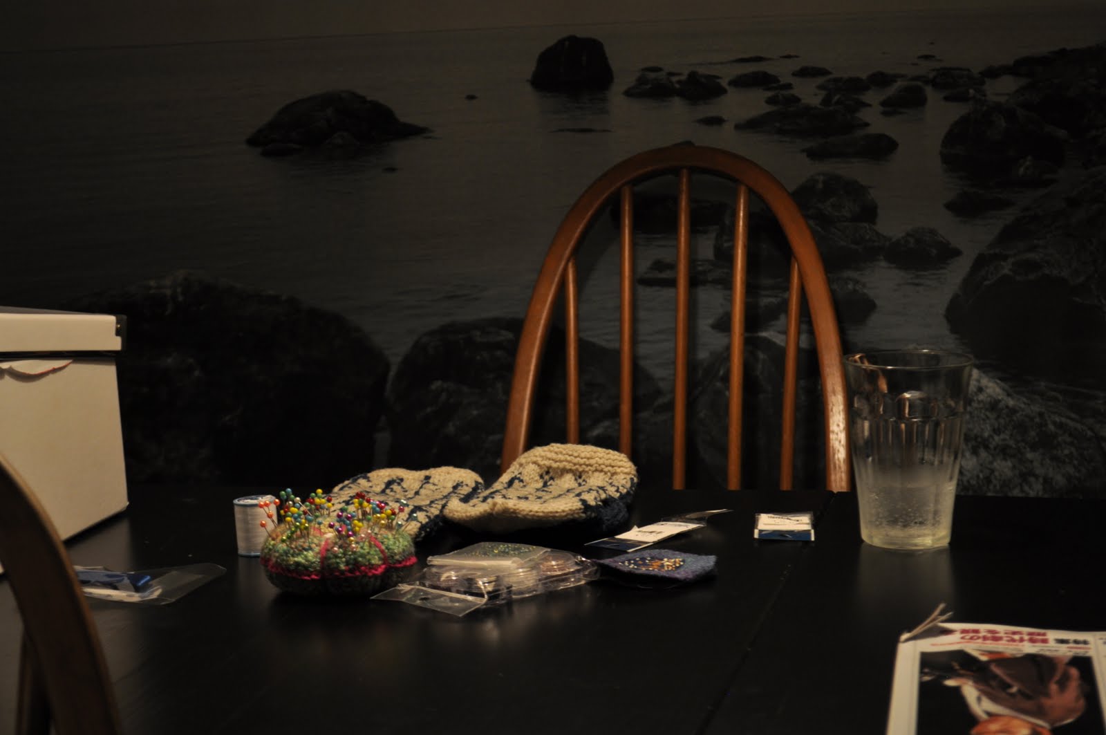 下は昨日の写真ですが、ピンクションやビーズ、お針箱を取り出して、手袋を仕上げているところ。