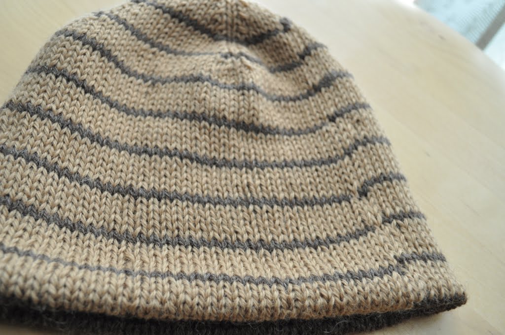 The below, Christopher hat by Jane Richmond, was also a very simple pattern yet fun. The only drawback is that you have to knit twice as much in order to make it reversible. But it turned out well, and was well received by another friend.