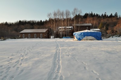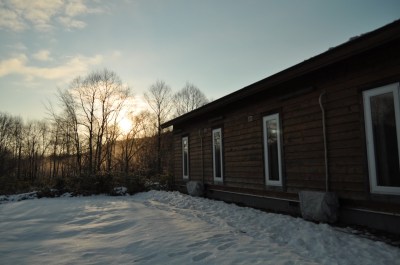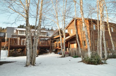 お庭側からみた敷地全景。左が別棟の宿泊棟で、右が食堂とお部屋とオーナーご家族のお住まいです。後ろの山には熊がいるそう。
