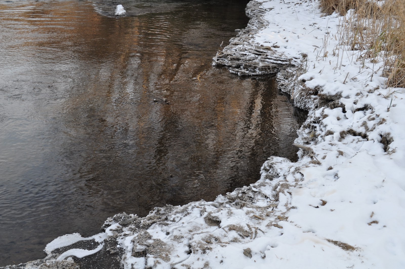 川岸はこんな感じで層になって凍っていて、これが段々と川の中心に向かって広がっていく。River banks were starting to freeze – in cascading layers.