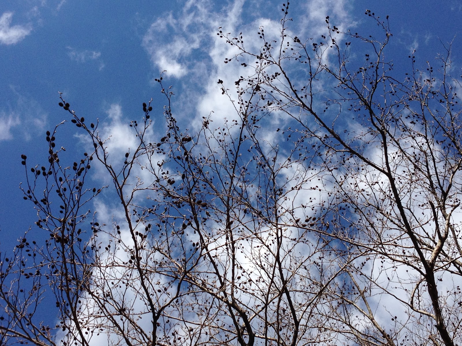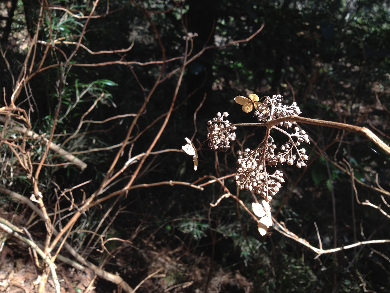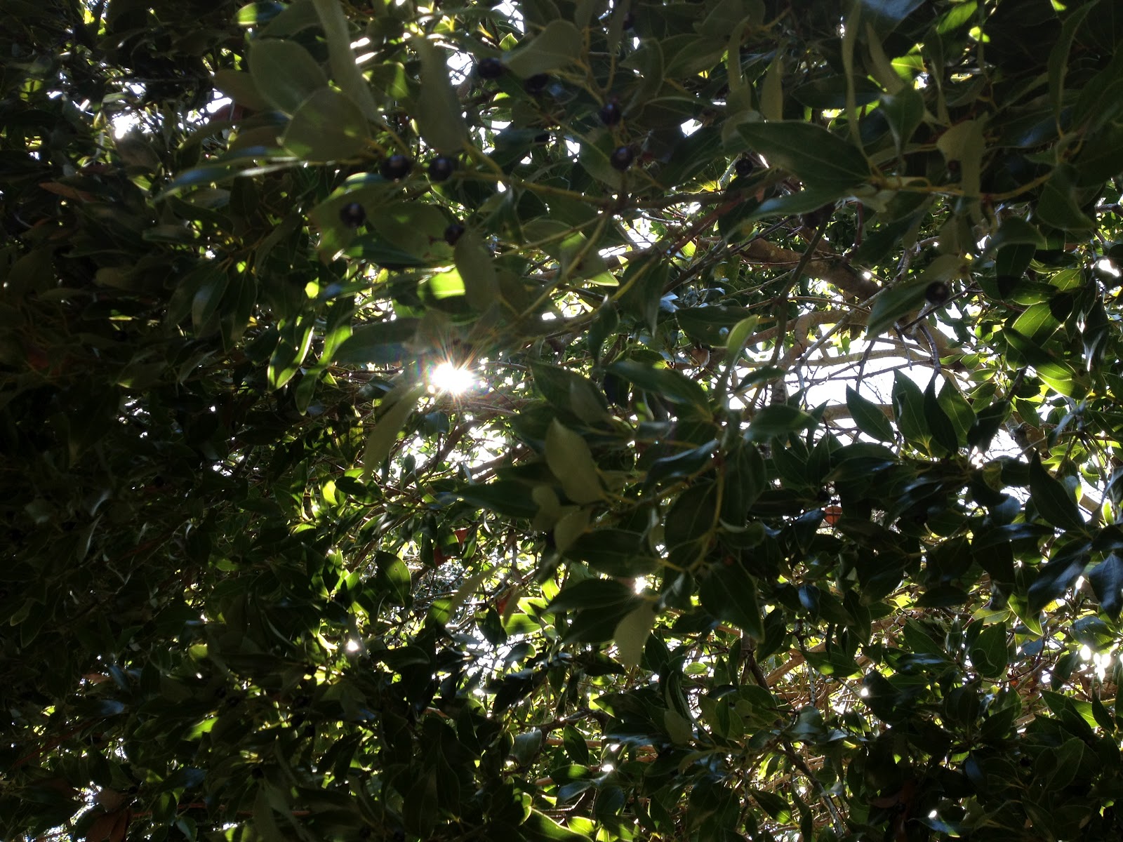 ブルーベリーのような青紫の実がなった木(下)。春の日差しが透けています。