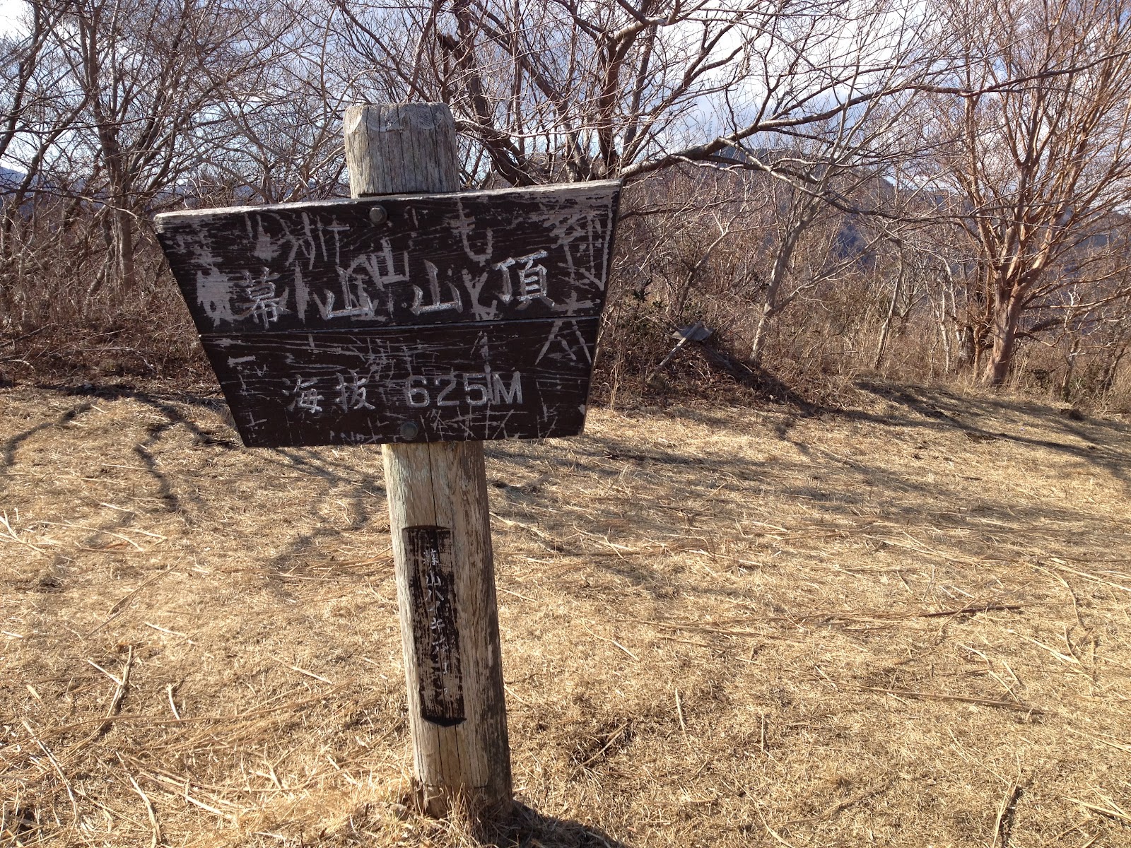 と思ったら、さっきのは隣の山で、まだ道は続いていました。それから10分くらい歩いたところで幕山の頂上。落書きだらけで微妙な感じですが(笑)。読めん。