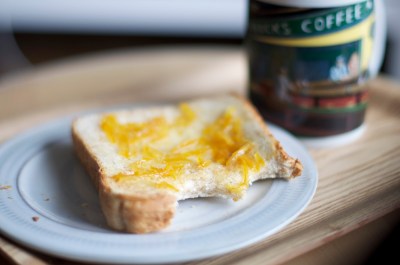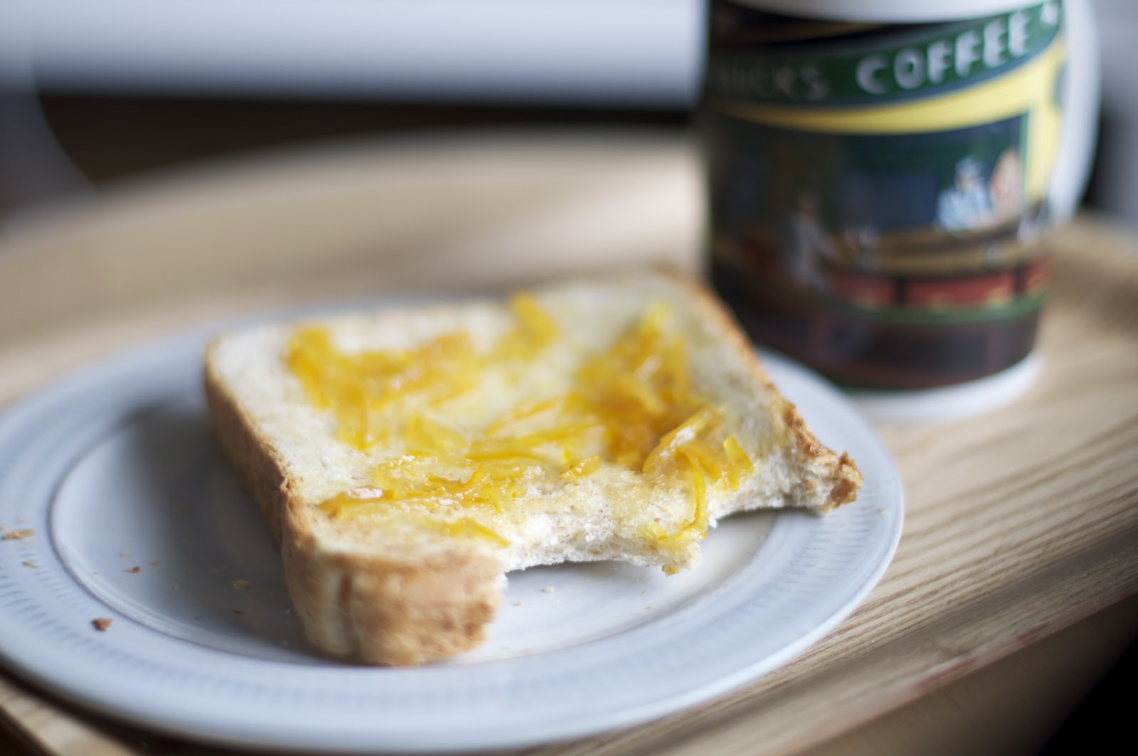 Saturday morning. Breakfast with coffee and a toast, going through some things I bought on the previous night.