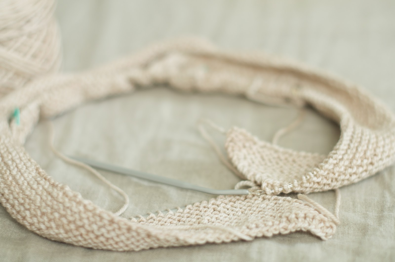 rokoさんデザインのLull(夕凪)、あさぼらけ、のような色の糸で編み始めました。早くも中毒注意報出ています。