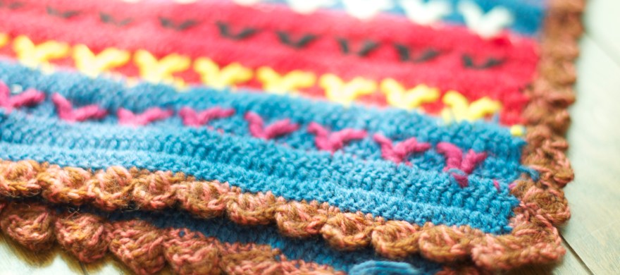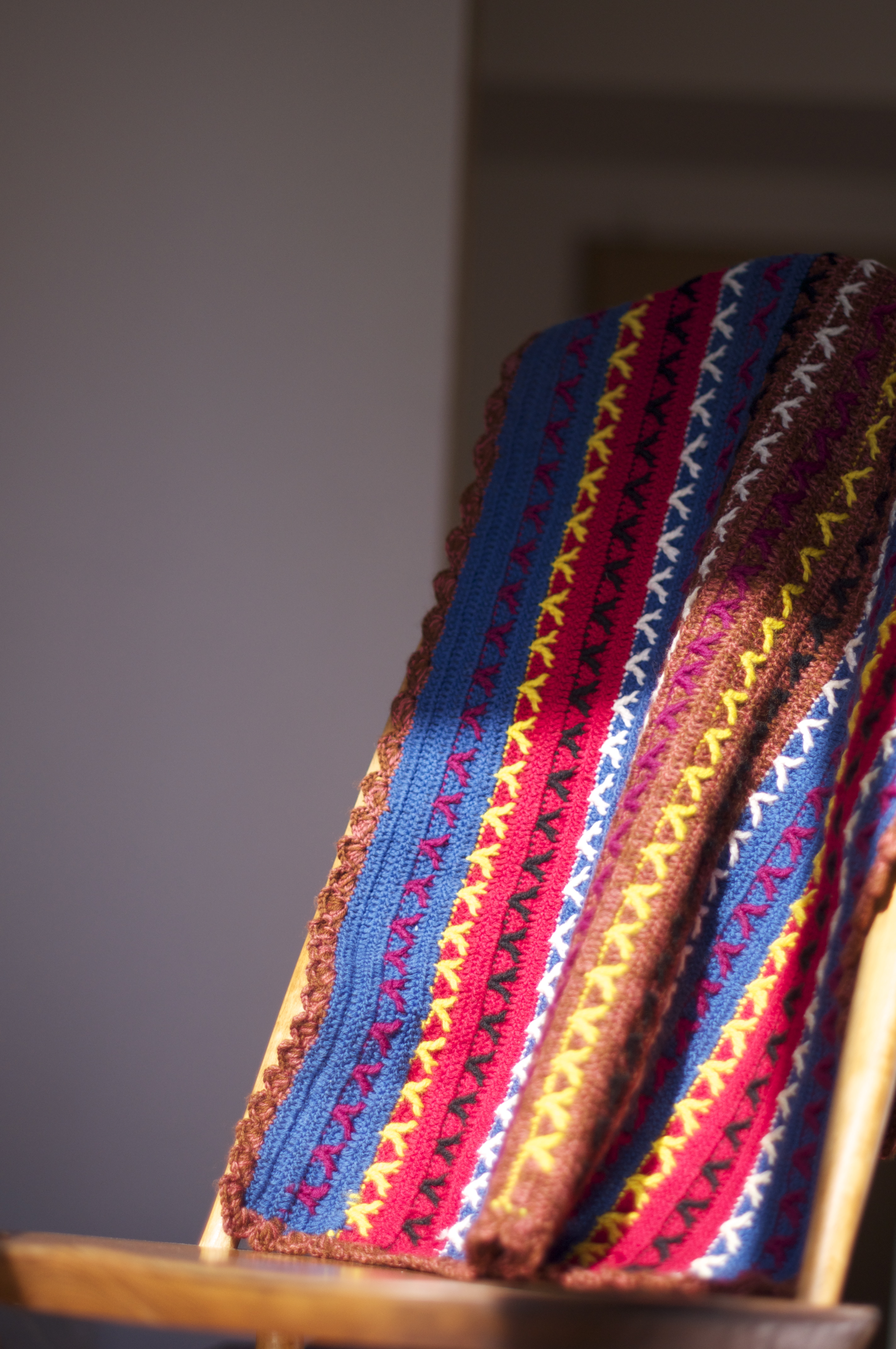 This blanket is not the most beautiful thing I’ve ever seen, but it is using a technique that I’ve never seen in anywhere else. She used some leftover yarns and had to come up with a way to make it look special.